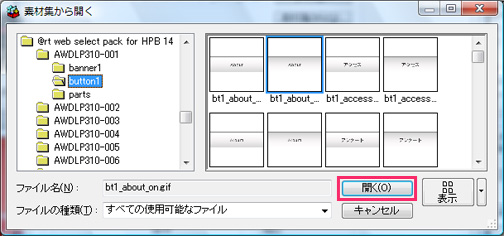 3.通常時の画像に「bt1_about_off.gif」を使用したので「bt1_about_on.gif」を選択し、「開く」をクリックします。