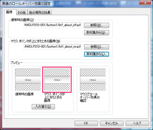 1.「バナー、ボタン等各種パーツを差し替える」を参考に「会社案内」ボタンを「bt1_about_off.gif」に変更し、「ロールオーバー効果の設定」をクリックします。