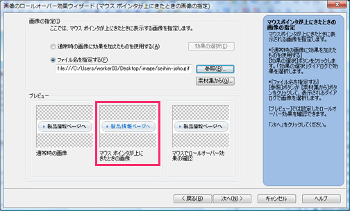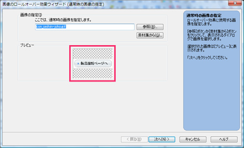 4.「画像のロールオーバー効果ウィザード」でロールオーバーを設定する画像を確認します。確認したら「次へ」をクリックします。