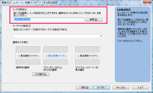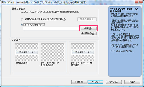 5.マウスポインタが上にきたときに表示する画像を設定します。「ファイル名を指定する」を選択し、「参照」ボタンをクリックします。
